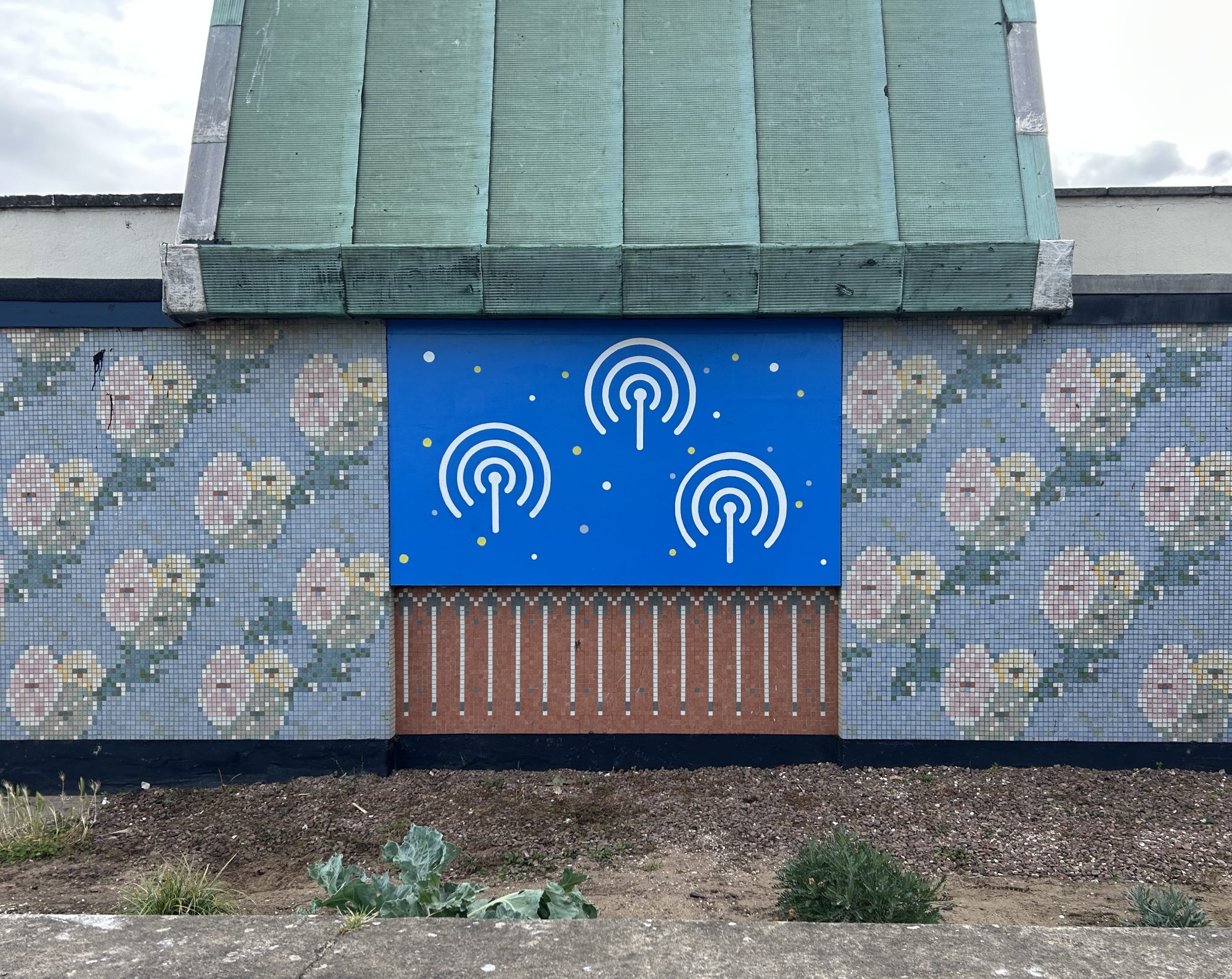 Their Warning Lights mural, installed for the 2025 Art Walk Porty Festival, takes the beacon symbol as an indicator of warning as well as celebration, whilst designating the Shore Hunt growing space; evoking a space to gather, a space for creativity, hope and celebration, but also of criticality and caution.