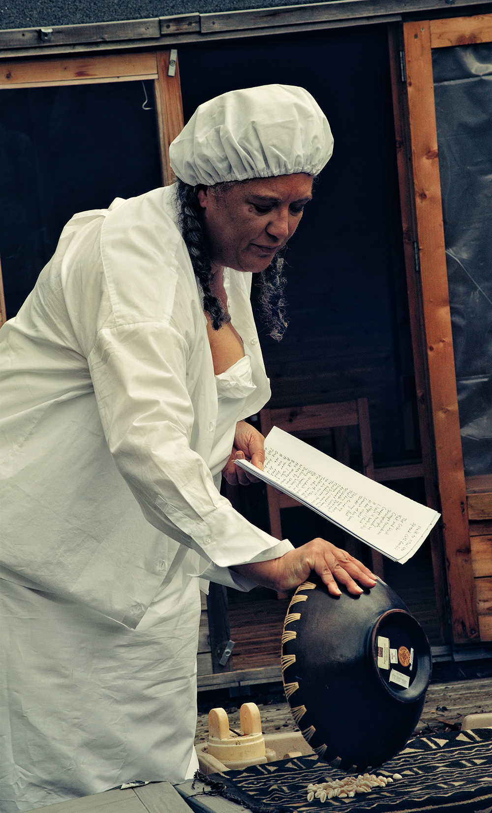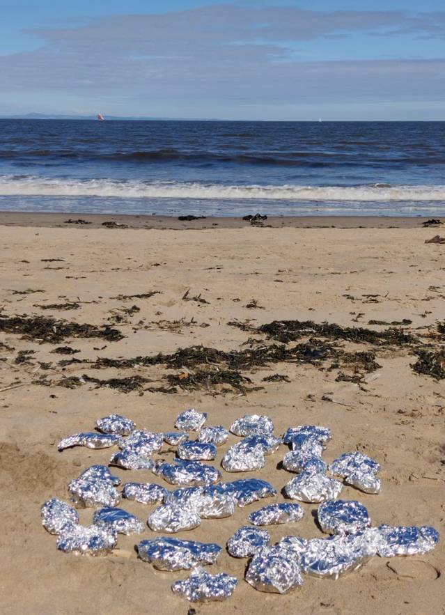 Simultaneously a performance, workshop and ceremony bringing together fire, ceramic, salt and writing, Salt Wound invites participants to use tinfoil to encase ceramic pieces in salt, then to unearth them from the ashes transformed into a myriad of different patterns and colours. The work also speaks on pyromancy (meaning divination by means of fire) and water as a place for cleansing and mourning.