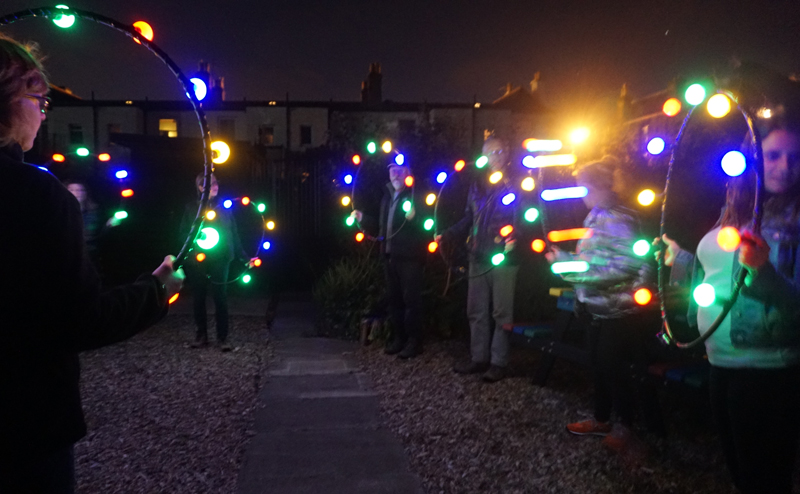 Created by artist Deirdre Macleod, Festoon invited participants to walk slowly in a line, carrying portable lighted frames around the darker spaces of Portobello during the 2018 Art Walk Porty Pleasure Ground programme – spaces that can be lost after dark, to create a walking illumination.