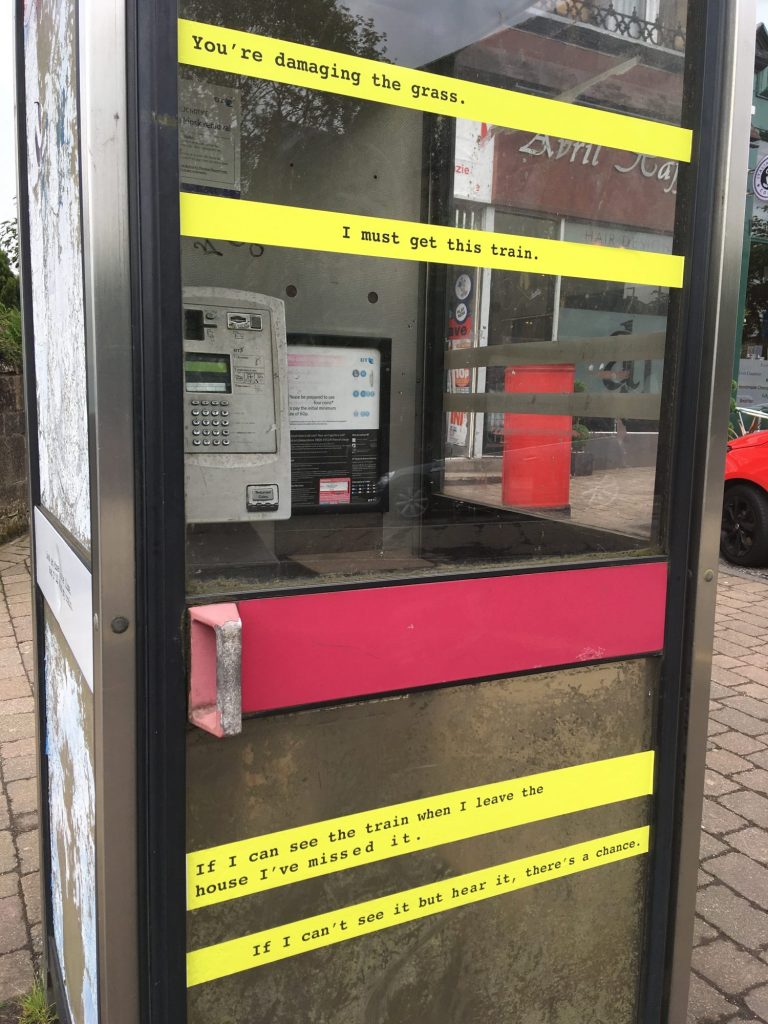Jacqueline Donachie contemporary artist, living in Lenzie, contributed to the published newspaper (image above) with a feature article ‘The circle of park and run’ together with text from the article placed on the disused telephone kiosk in the central shopping area of the town.
