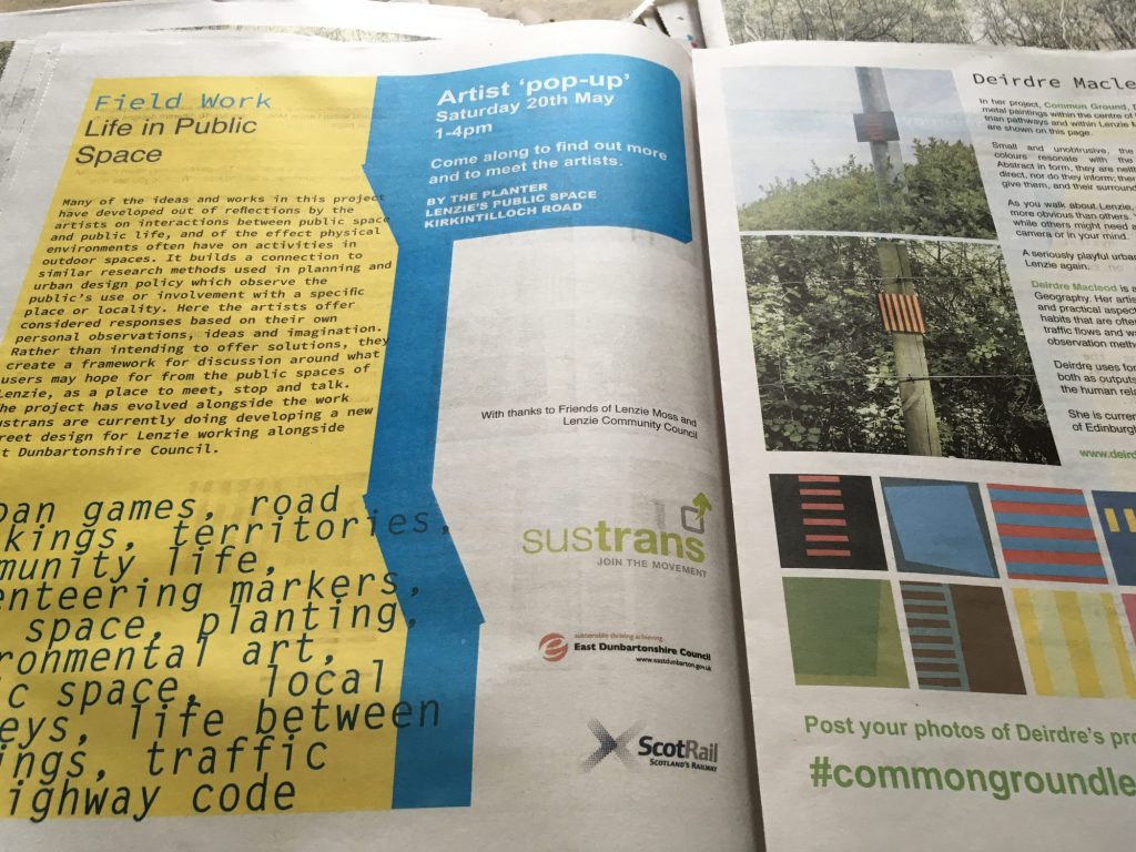 Deirdre Macleod’s ‘Common Ground’ project centred around the placing of 50 colourful metal paintings within the centre of Lenzie, amongst its pedestrian pathways and within Lenzie Moss. Small and unobstrusive the paintings, neither way-markers nor street signs, served as a playful urban game, encouraging all to look again at their local surroundings.